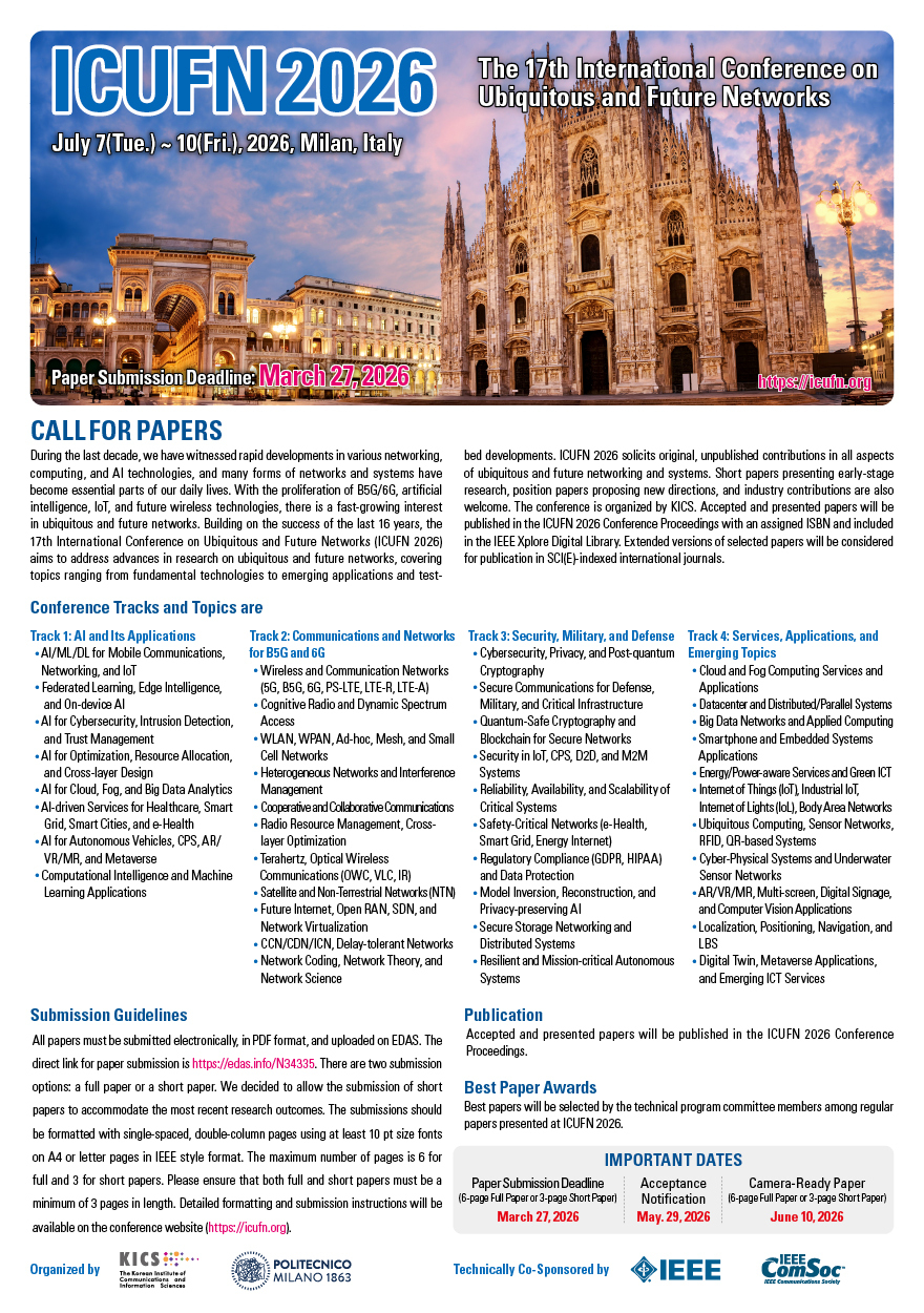 Accepted and presented papers will be published in the ICUFN 2026 Conference